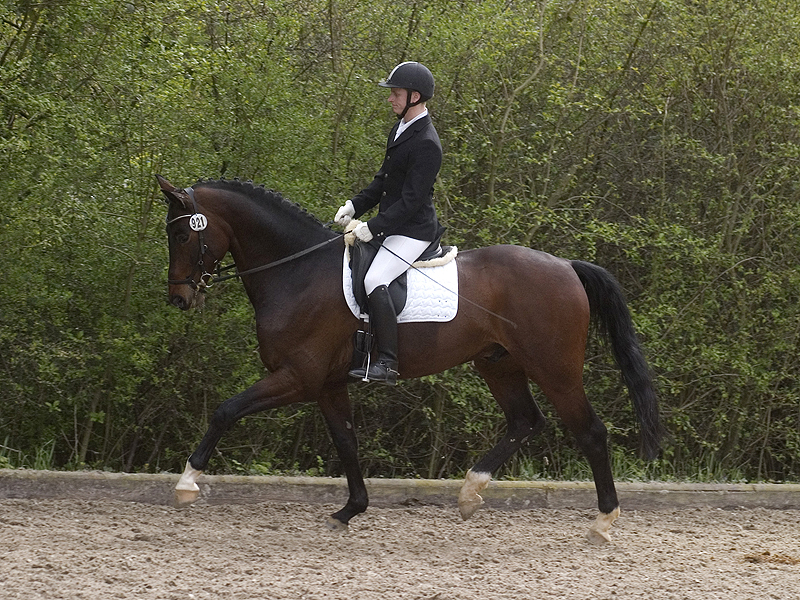 Besonders erfreulich startete die Turniersaison für Leonie mit dem gerade 7jährigen DONIZETTI auch "Ecki genannt" (v. Don Frederico - Lauries Crusador xx). Nachdem alle vier erfolgreichen S-Pferde des vergangenen Jahres ihren Besitzer wechselten und leider unseren Stall verlassen haben. Einen ersten Versuch unternahm Leonie mit DONIZETTI in Hildesheim, bei dem gleich Platz 5 beim ersten Start in einer M** heraus sprang.